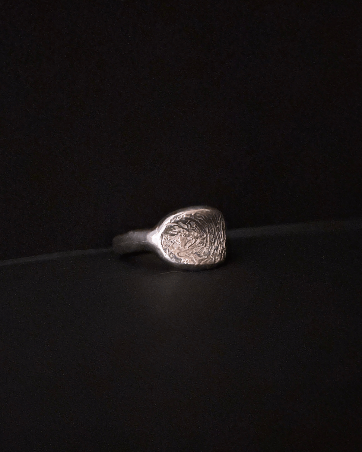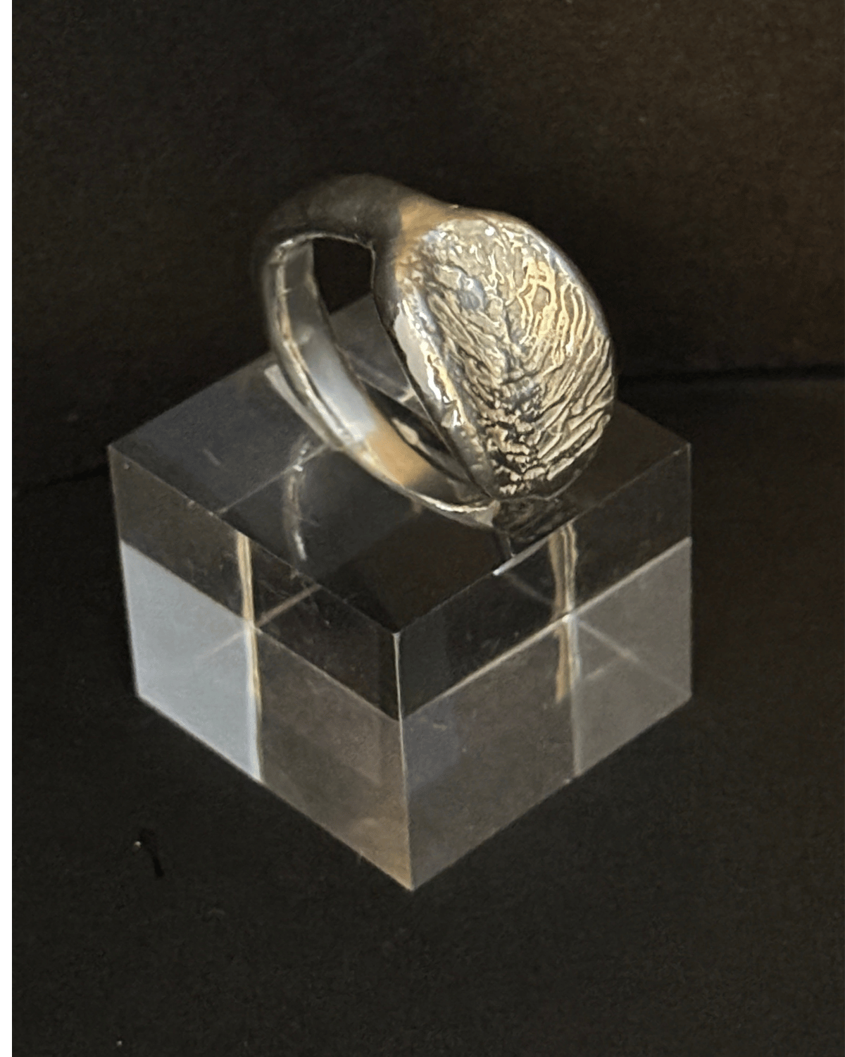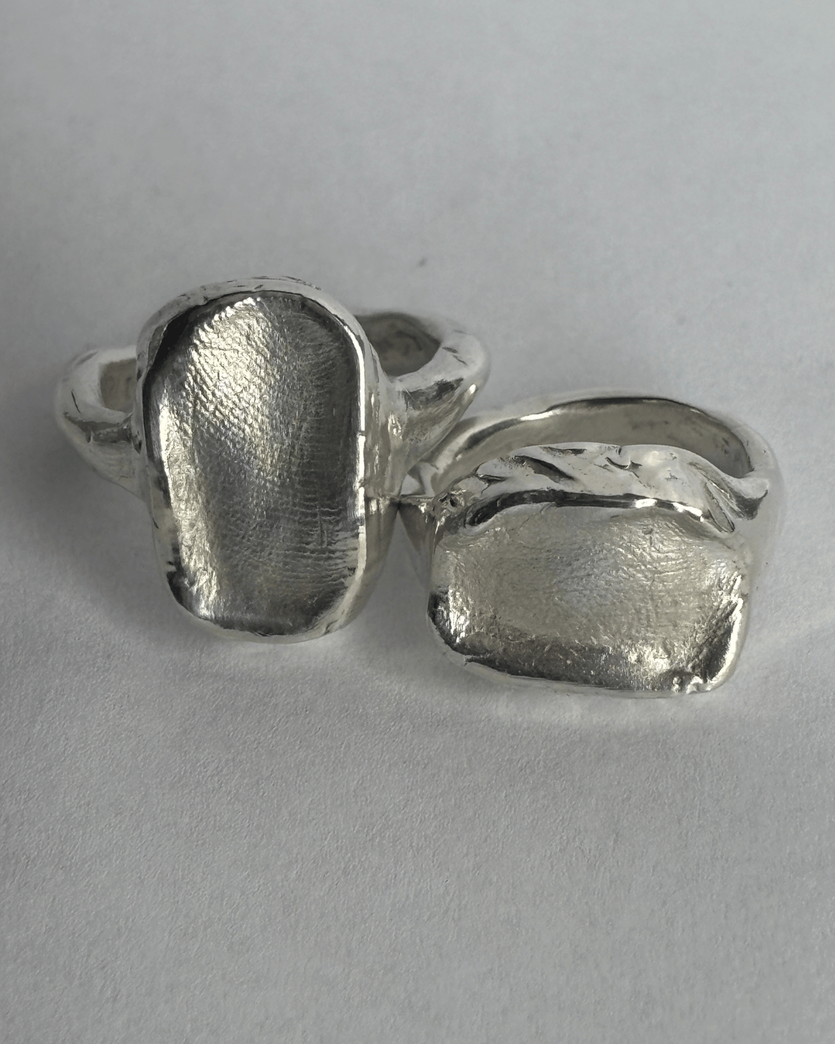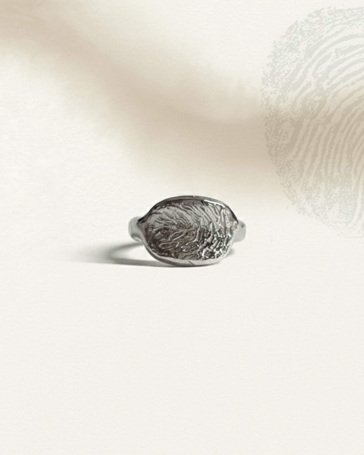 Een vingerafdruk op papier, een bestaande afdruk, een tastbare herinnering — ik vertaal die naar een hanger of ring in zilver.